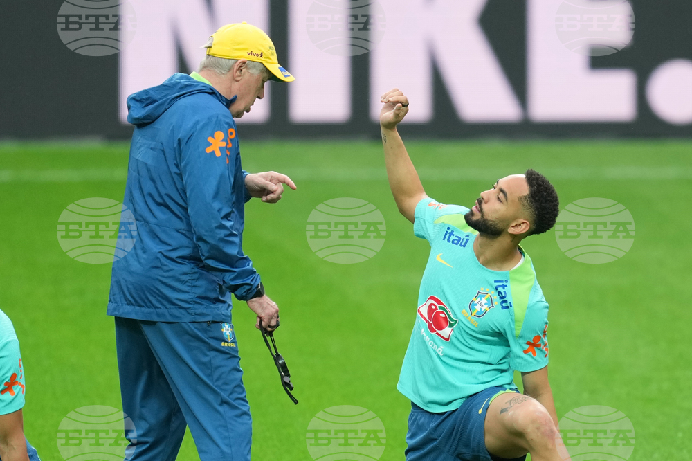 Brazil's coach Carlo Ancelotti, left, speaks to Matheus Cunha, right, during a training session ahead of a friendly soccer match against South Korea at Seoul World Cup Stadium in Seoul, South Korea, Thursday, Oct. 9, 2025. (AP Photo/Lee Jin-man)