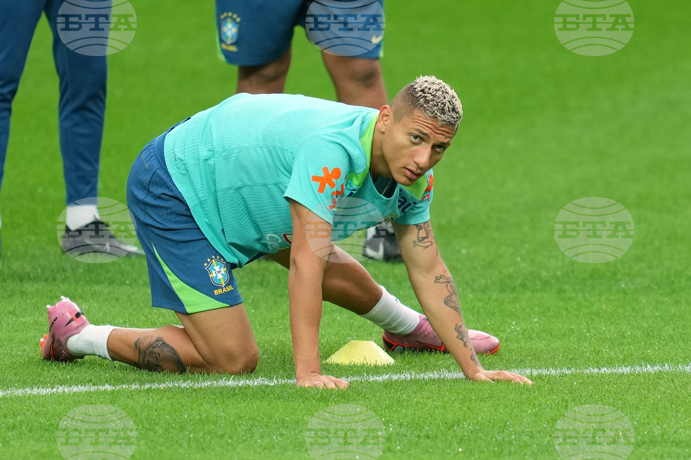 Brazil's Richarlison warms up during a training session ahead of a friendly soccer match against South Korea at Seoul World Cup Stadium in Seoul, South Korea, Thursday, Oct. 9, 2025. (AP Photo/Lee Jin-man)