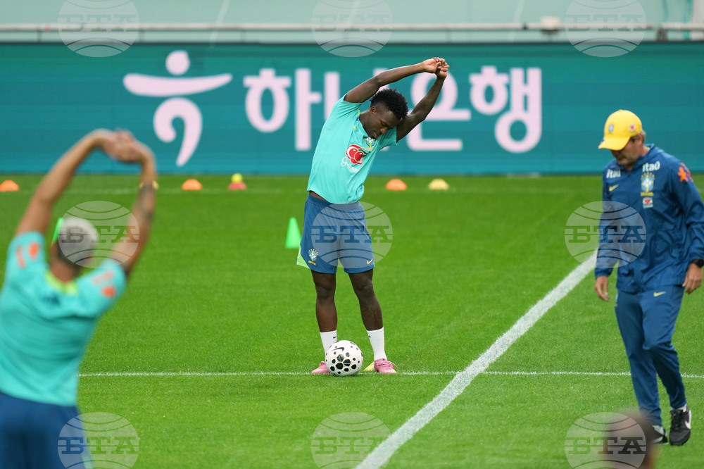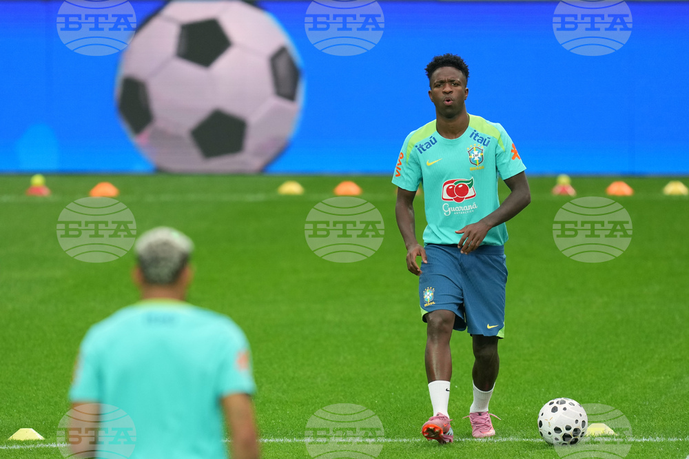 Brazil's Vinicius Junior warms up during a training session ahead of a friendly soccer match against South Korea at Seoul World Cup Stadium in Seoul, South Korea, Thursday, Oct. 9, 2025. (AP Photo/Lee Jin-man)