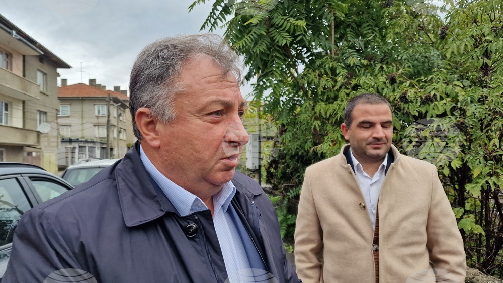Шумен (9 октомври 2025) Първа копка за реконструкция на канализацията по улица „Тича“ и изграждане на нова улична канализация по улица „Червена стена“ в Шумен. Кметът на община Шумен, директорът на Дирекция "Устройство на територията" в Община Шумен Нора Чалъкова и представител на фирмата изпълнител дават брифинг на мястото на строителните дейности. На снимката: кметът на община Шумен проф. Христо Христов (вляво) и представителят на фирмата изпълнител Владимир Йорданов (вдясно).