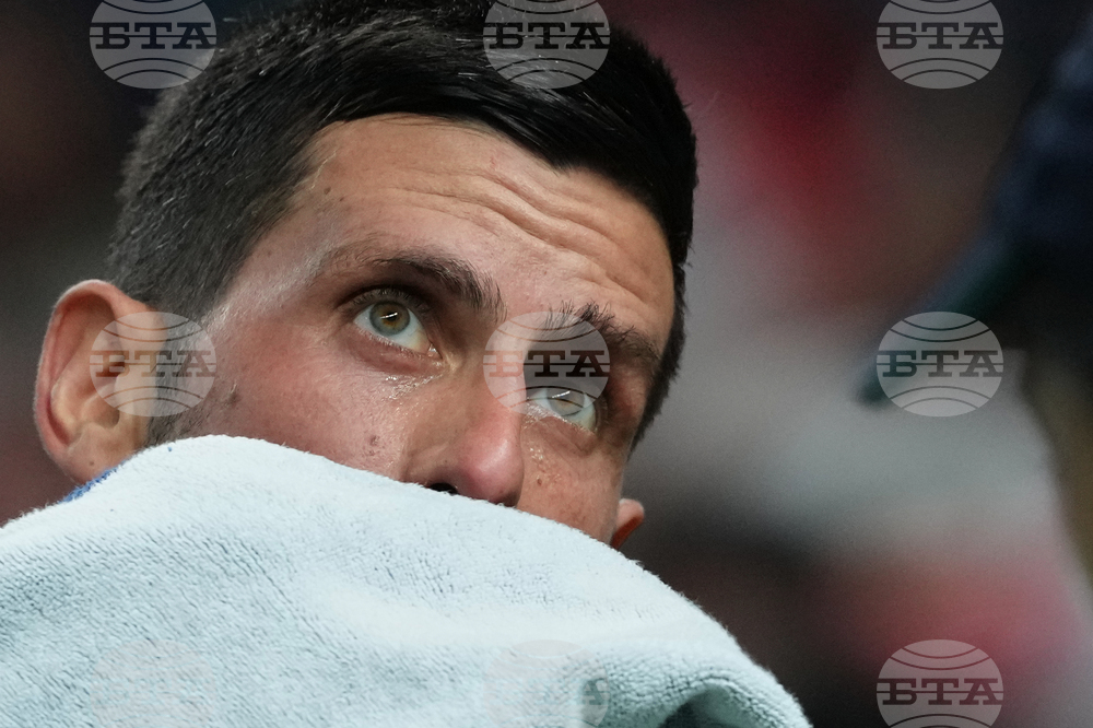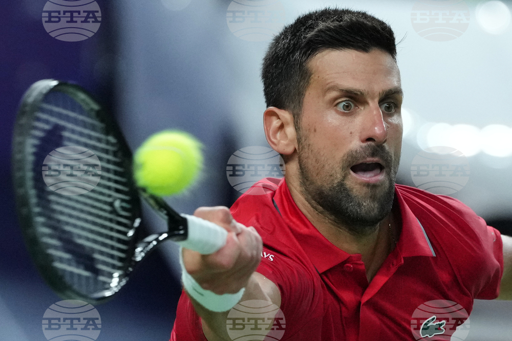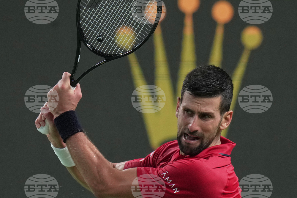 Zizou Bergs of Belgium misses the shot from Novak Djokovic of Serbia during the men's singles quarterfinal match of the Shanghai Masters tennis tournament at Qizhong Forest Sports City Tennis Center, in Shanghai, China, Thursday, Oct. 9, 2025. (AP Photo/Andy Wong)