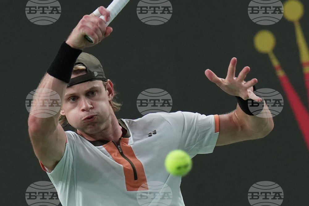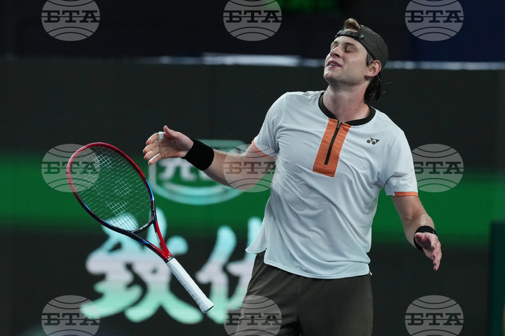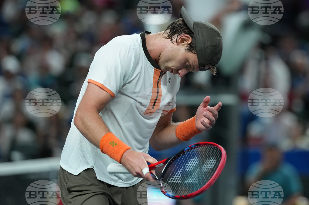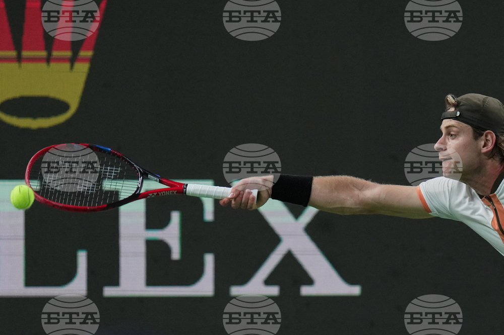 Zizou Bergs of Belgium reaches for a ball during the men's singles quarterfinal match against Novak Djokovic of Serbia, at the Shanghai Masters tennis tournament at Qizhong Forest Sports City Tennis Center, in Shanghai, China, Thursday, Oct. 9, 2025. (AP Photo/Andy Wong)