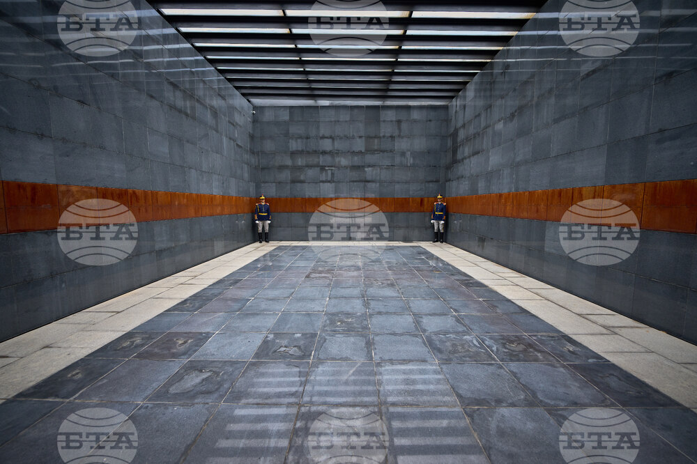 Honor guard soldiers stand at the Holocaust Memorial during the ceremony marking the National Holocaust Memorial Day in Bucharest, Romania, Thursday, Oct. 9, 2025. (AP Photo/Vadim Ghirda)