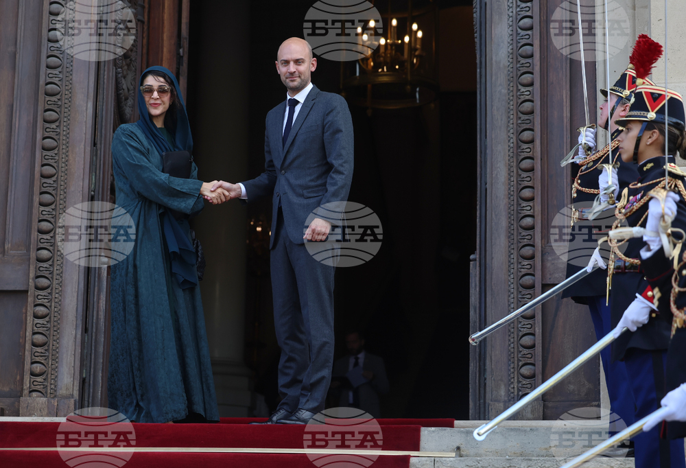 Emirati Minister of State for International Cooperation Reem Ebrahim Al-Hashimi, left, is welcomed by France's outgoing Minister of Foreign Affairs Jean-Noel Barrot for mideast talks with European and Arab countries at the foreign ministry in Paris, France, Thursday, Oct. 9, 2025. (Thomas Samson, Pool Photo via AP)