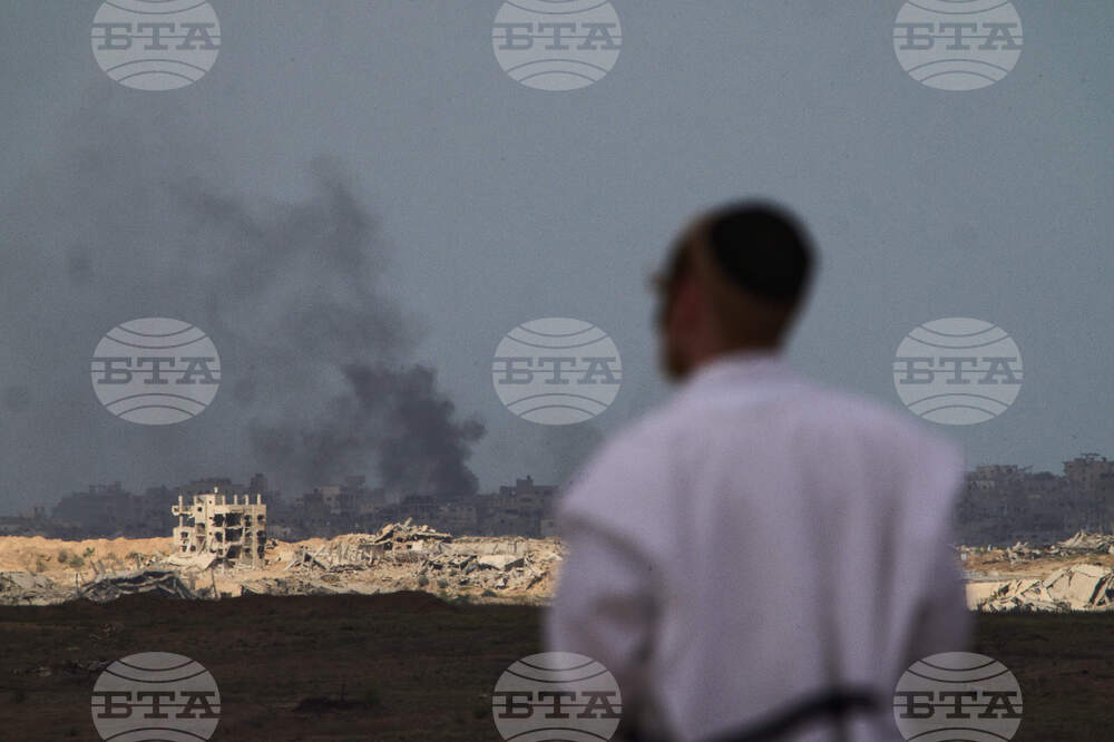 Jewish men observe smoke rising to the sky after an explosion in the Gaza Strip, as seen from southern Israel, Thursday, Oct. 9, 2025, following the announcement that Israel and Hamas have agreed to the first phase of a peace plan to pause the fighting. (AP Photo/Ariel Schalit)