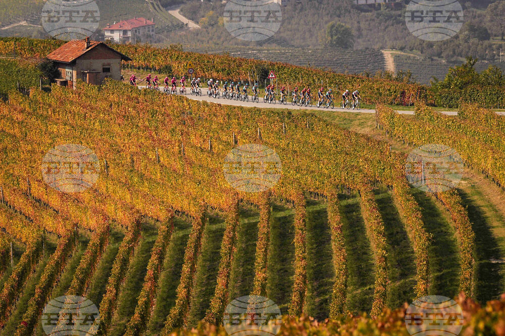 Peloton rides during the 109th edition of the Gran Piemonte cylcling race, a 179km (111 miles) one day race from Dogliani to Acqui Terme, Italy, Thursday, Oct. 9, 2025, Italy. (Marco Alpozzi/LaPresse via AP)