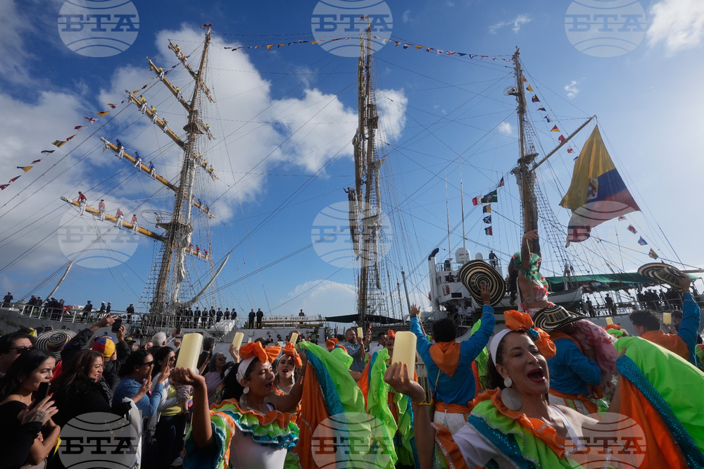 Dancers perform as the ARC Gloria, a Colombian tall ship, arrives for Fleet Week in San Francisco, Thursday, Oct. 9, 2025. (AP Photo/Jeff Chiu)