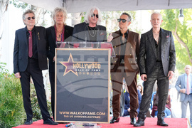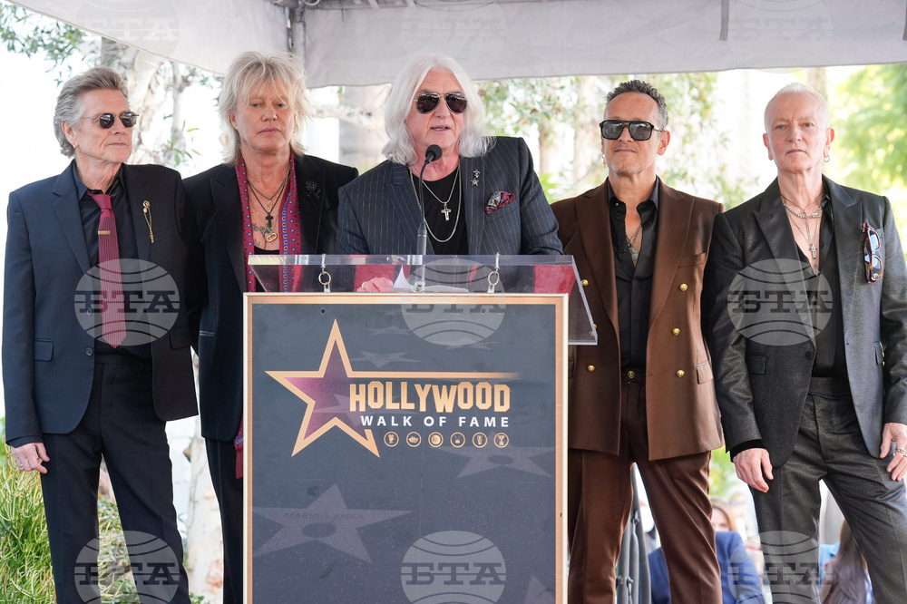 Vivian Campbell, from left, Joe Elliott, Rick Allen, Rick Savage, and Phil Collen of Def Leppard pose with their new star during a ceremony on the Hollywood Walk of Fame on Thursday, Oct. 9, 2025, in Los Angeles. (AP Photo/Chris Pizzello)