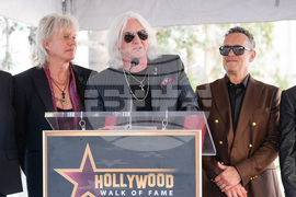 Rick Savage, from left, Joe Elliott, and Vivan Campbell of Def Leppard speak during a ceremony honoring Def Leppard with a star on the Hollywood Walk of Fame on Thursday, Oct. 9, 2025, in Los Angeles. (AP Photo/Chris Pizzello)