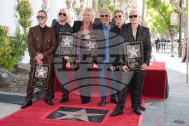 Vivian Campbell, second from left, Joe Elliott, Rick Allen, Phil Collen, and Rick Savage of Def Leppard pose with their new star with Bruce Resnikoff, left, and Jon Bon Jovi, right, during a ceremony on the Hollywood Walk of Fame on Thursday, Oct. 9, 2025, in Los Angeles. (AP Photo/Chris Pizzello)