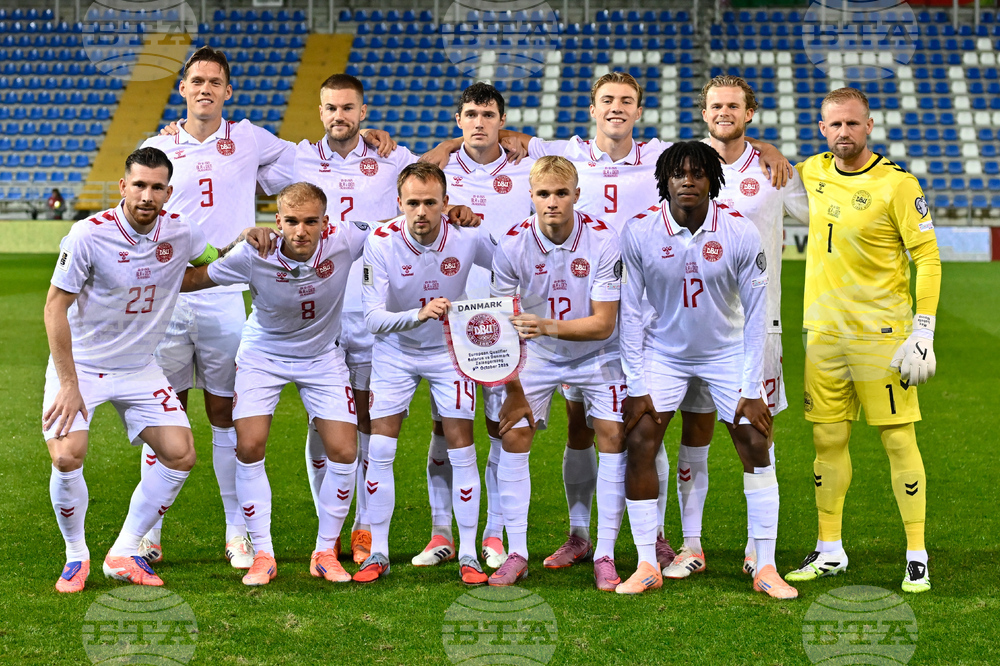 Denmark starting players pose for a team photo at the beginning of the World Cup qualifying soccer match between Belarus and Denmark at the ZTE Arena stadium, Zalaegerszeg, Hungary, Thursday, Oct. 9, 2025. (AP Photo/Denes Erdos)