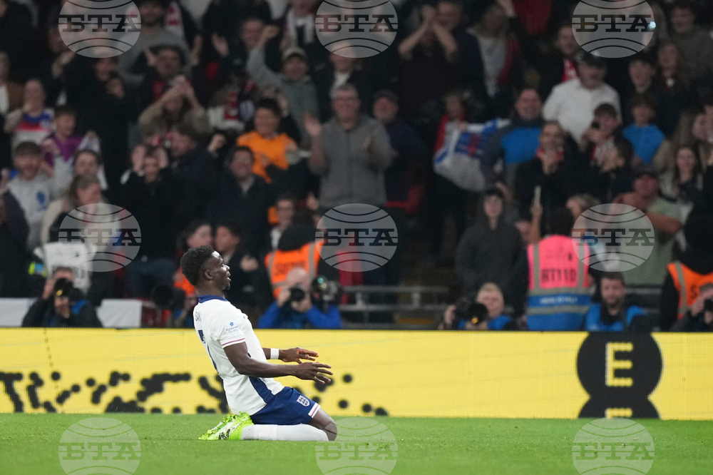 England's Bukayo Saka scores their side's third goal of the game during an international friendly soccer match between England and Wales at Wembley stadium in London, Thursday, Oct. 9, 2025. (Adam Davy/PA via AP)