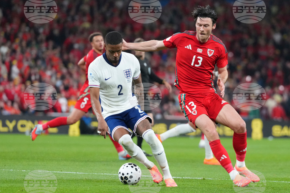 England's Ezri Konsa is challenged by Wales's David Brooks, rear, during an international friendly soccer match between England and Wales at Wembley stadium in London, Thursday, Oct. 9, 2025. (AP Photo/Frank Augstein)