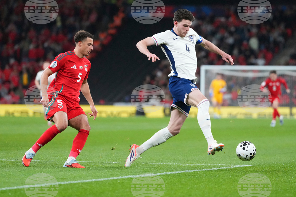 England's Declan Rice, right, is challenged by Wales's Ethan Ampadu during an international friendly soccer match between England and Wales at Wembley stadium in London, Thursday, Oct. 9, 2025. (AP Photo/Frank Augstein)