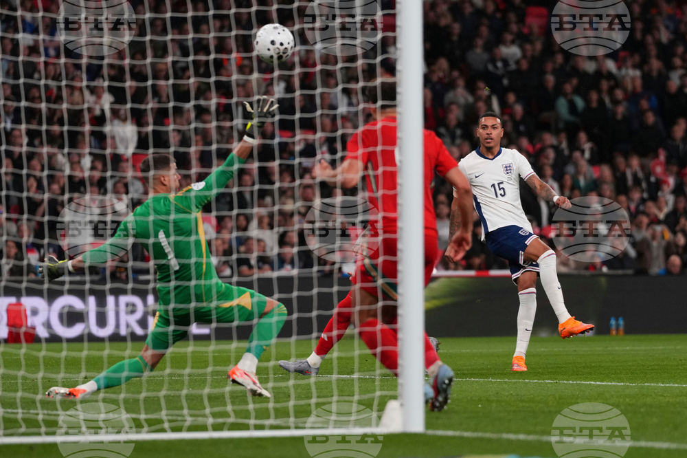 England's Ollie Watkins (19) scores their side's second goal of the game during an international friendly soccer match between England and Wales at Wembley stadium in London, Thursday, Oct. 9, 2025. (John Walton/PA via AP)