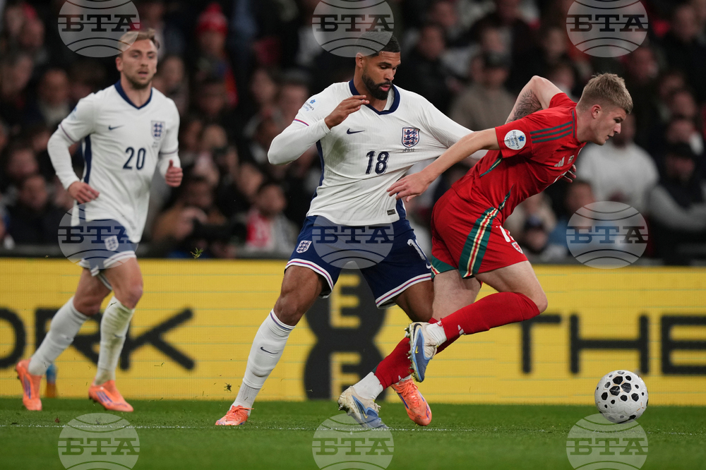 Wales's Jordan James, right, is challenged by England's Ruben Loftus-Cheek during an international friendly soccer match between England and Wales at Wembley stadium in London, Thursday, Oct. 9, 2025. (AP Photo/Frank Augstein)