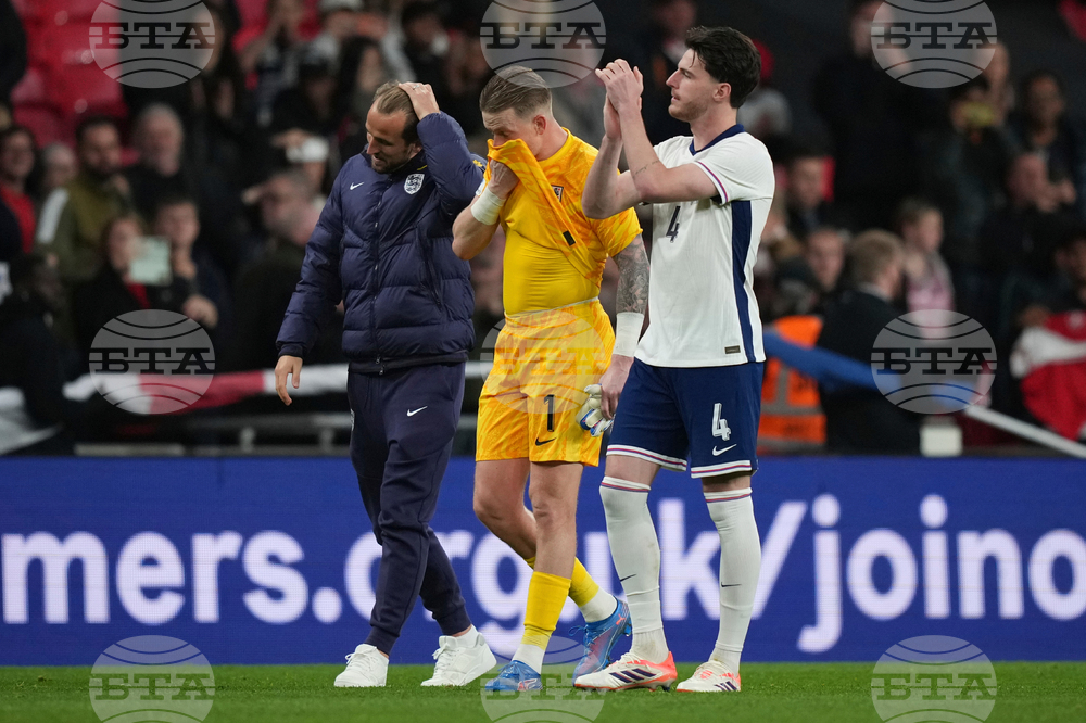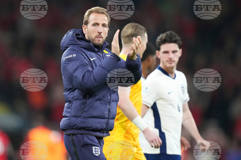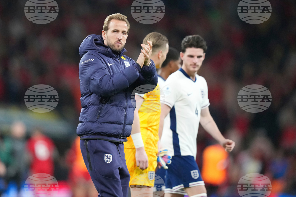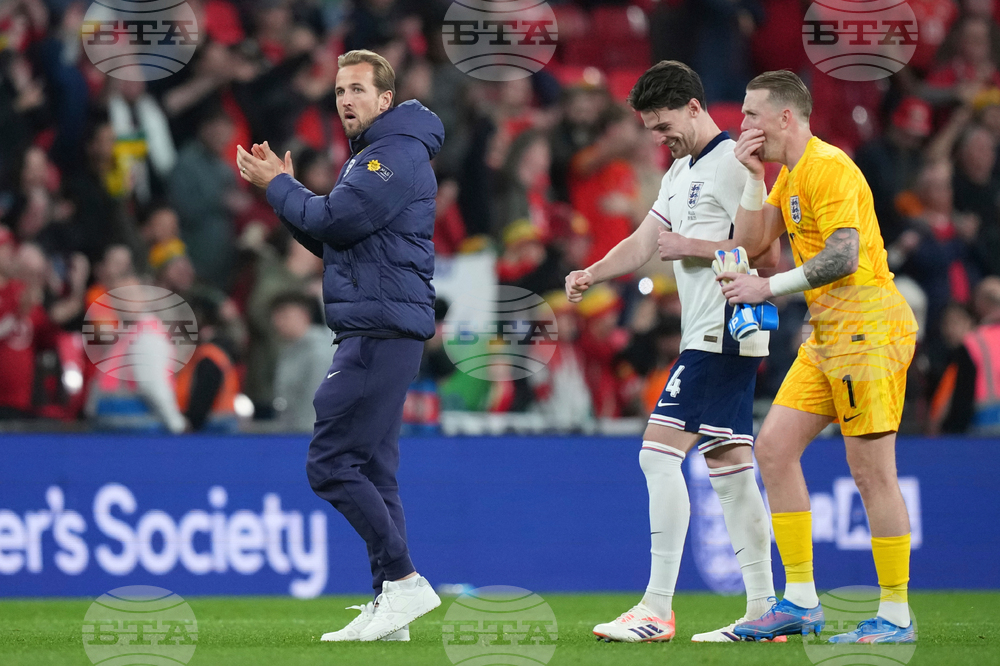 From left: England's Harry Kane, England's Declan Rice, and England's goalkeeper Jordan Pickford celebrate their victory after an international friendly soccer match between England and Wales at Wembley stadium in London, Thursday, Oct. 9, 2025. (AP Photo/Frank Augstein)