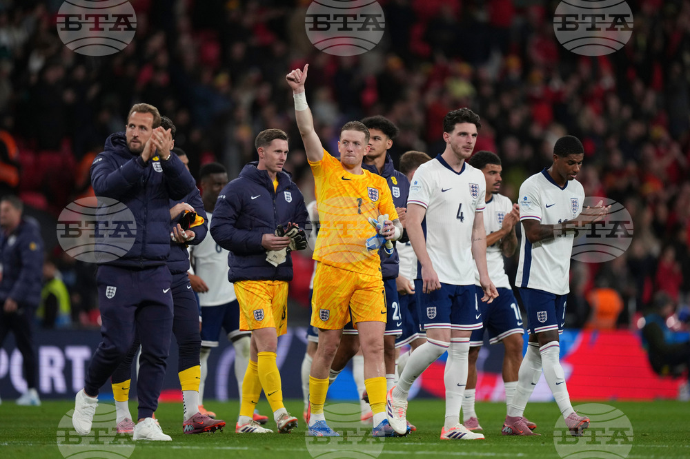 From left: England's Harry Kane, England's goalkeeper Jordan Pickford, and England's Declan Rice celebrate their victory after an international friendly soccer match between England and Wales at Wembley stadium in London, Thursday, Oct. 9, 2025. (AP Photo/Frank Augstein)