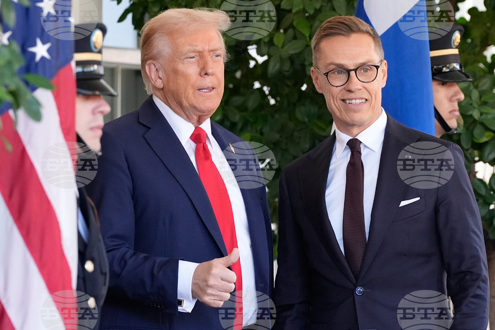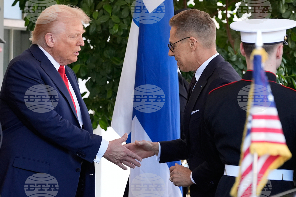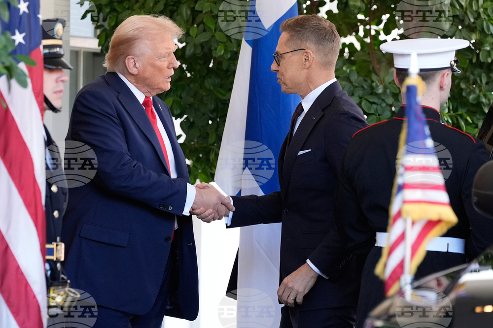 President Donald Trump greets Finland's President Alexander Stubb at the White House, Thursday, Oct. 9, 2025, in Washington. (AP Photo/Alex Brandon)