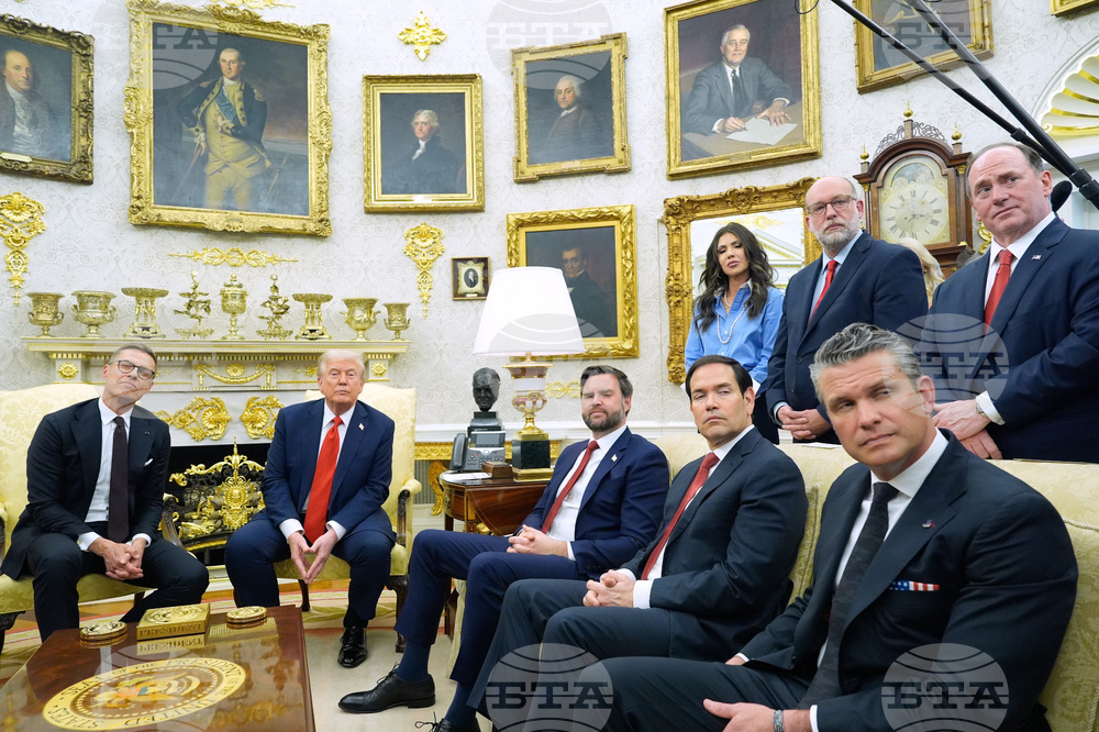 President Donald Trump and Finland's President Alexander Stubb listen to a question from a reporter as they meet in the Oval Office at the White House, Thursday, Oct. 9, 2025, in Washington, with Vice President JD Vance, Secretary of State Marco Rubio, Defense Secretary Pete Hegseth, Homeland Security Secretary Kristi Noem, Office of Management and Budget director Russell Vought and Secretary of the Navy John Phelan watching. (AP Photo/Alex Brandon)