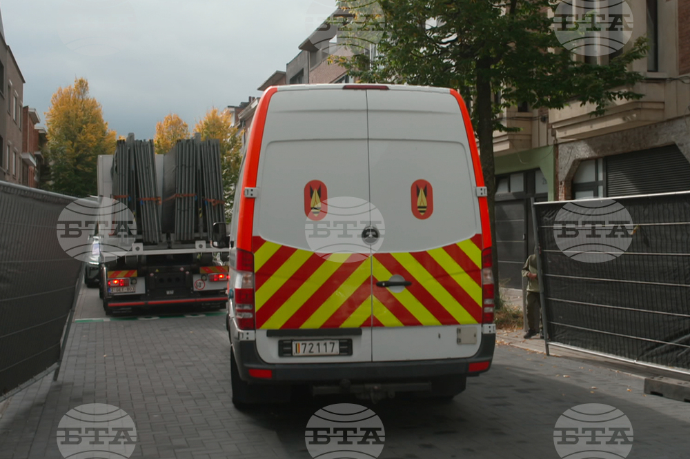 In this image taken from video provided by VTM, a bomb disposal truck is parked near a police cordon during an investigation in Antwerp, Belgium, Thursday, Oct. 9, 2025. (VTM via AP)