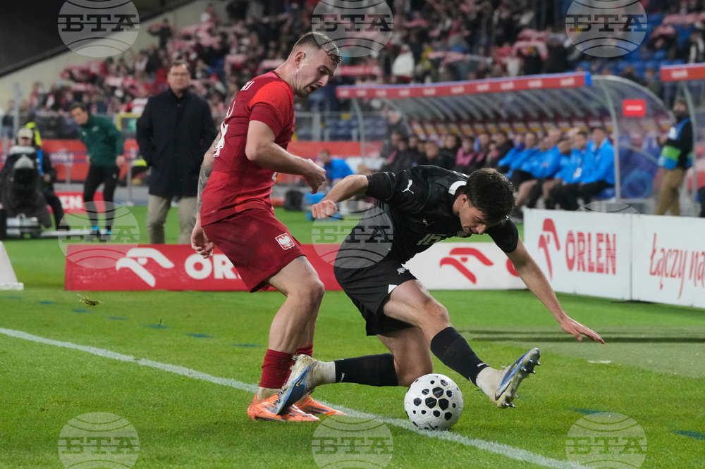 Poland's Przemyslaw Wisniewski, left, and New Zealand's Matthew Garbett challenge for the ball during a friendly soccer match between Poland and New Zealand at the Silesian Stadium in Chorzow, Poland, Thursday, Oct. 9, 2025. (AP Photo/Czarek Sokolowski)