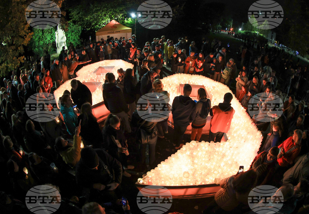 Visitors to the Festival of Lights place their candles in the big 89 in Leipzig, Germany, Thursday Oct. 9, 2025, to commemorate the Monday demonstrations in the fall of 1989, which led to the fall of the Socialist Unity Party of Germany and paved the way for German reunification. ( Jan Woitas/dpa via AP)