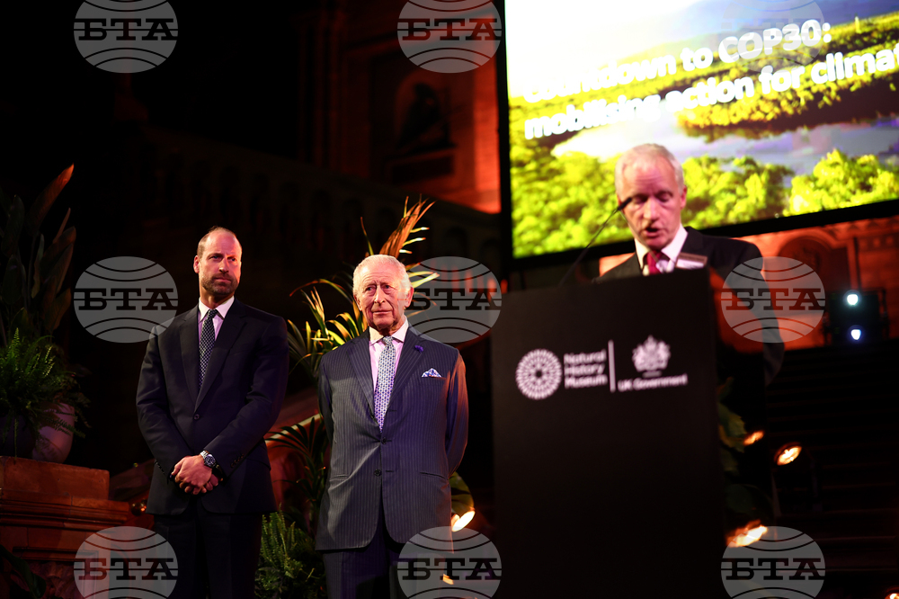 Britain's King Charles II, center, and Britain's Prince William, Prince of Wales, Iook on as a speaker addresses guest during the event 'Countdown to COP30: mobilising action for climate and nature' at the Natural History Museum in London on Oct. 9, 2025. . (Henry Nicholls/Pool Photo via AP)