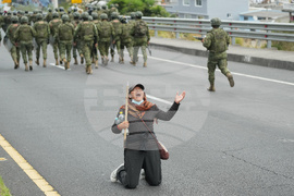 A woman shouts as soldiers arrive to clear the Pan-American Highway of demonstrators protesting the elimination of diesel subsidy by President Daniel Noboa's government, in Calderon, Ecuador, Thursday, Oct. 9, 2025. (AP Photo/Dolores Ochoa)