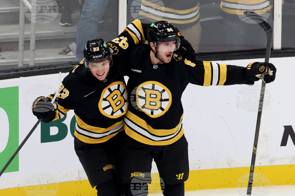 Boston Bruins center Fraser Minten, left, and Boston Bruins left wing Tanner Jeannot, right, celebrate after Jeannot's goal during the second period of an NHL hockey game against the Chicago Blackhawks, Thursday, Oct. 9, 2025, in Boston. (AP Photo/Mark Stockwell)