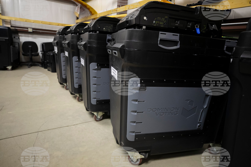 FILE - Dominion Voting ballot counting machines are lined up at a Torrance County warehouse during a testing of election equipment in Estancia, N.M., Sept. 29, 2022.(AP Photo/Andres Leighton, File)