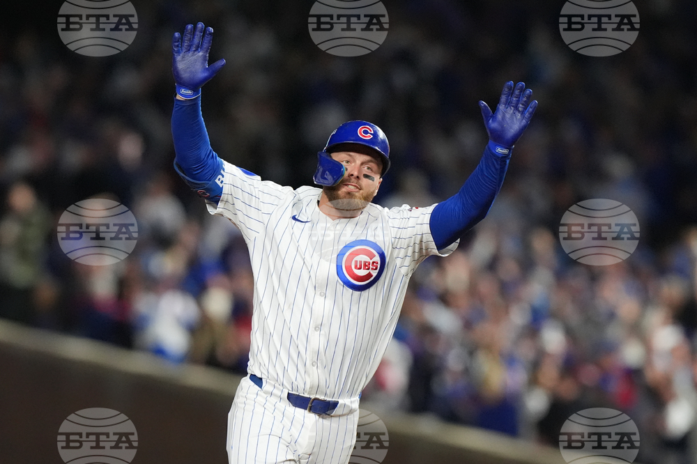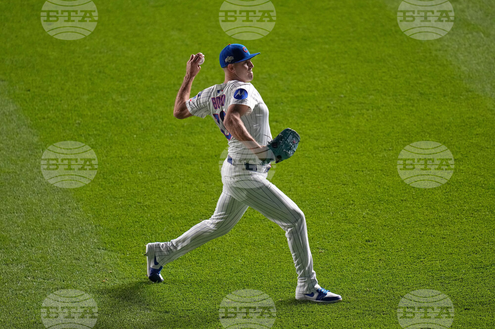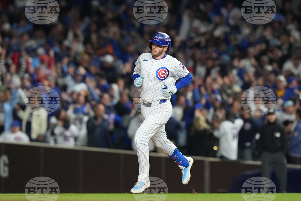 Chicago Cubs players warm up before Game 4 of baseball's National League Division Series against the Milwaukee Brewers, Thursday, Oct. 9, 2025, in Chicago. (AP Photo/Erin Hooley)