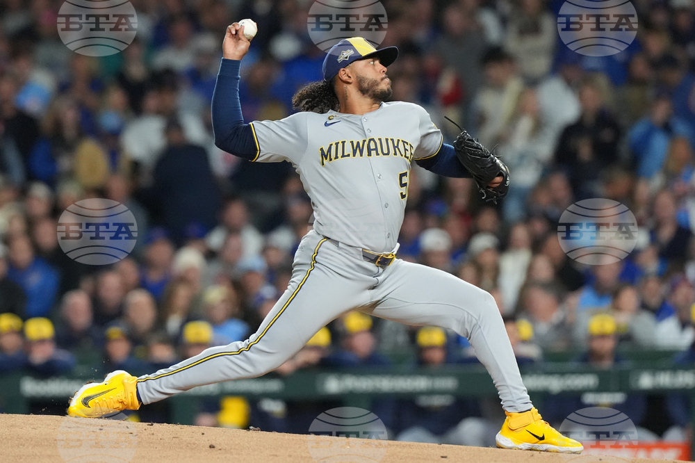 Milwaukee Brewers starting pitcher Freddy Peralta (51) delivers during the first inning of Game 4 of baseball's National League Division Series against the Chicago Cubs Thursday, Oct. 9, 2025, in Chicago. (AP Photo/Nam Y. Huh)