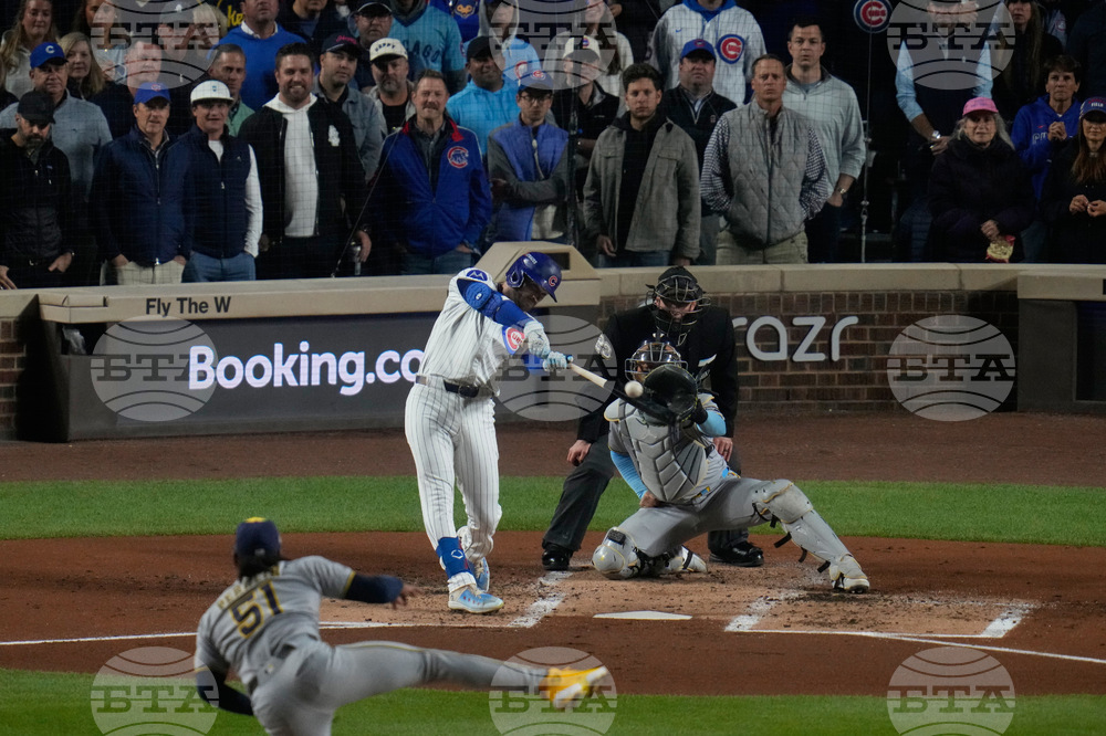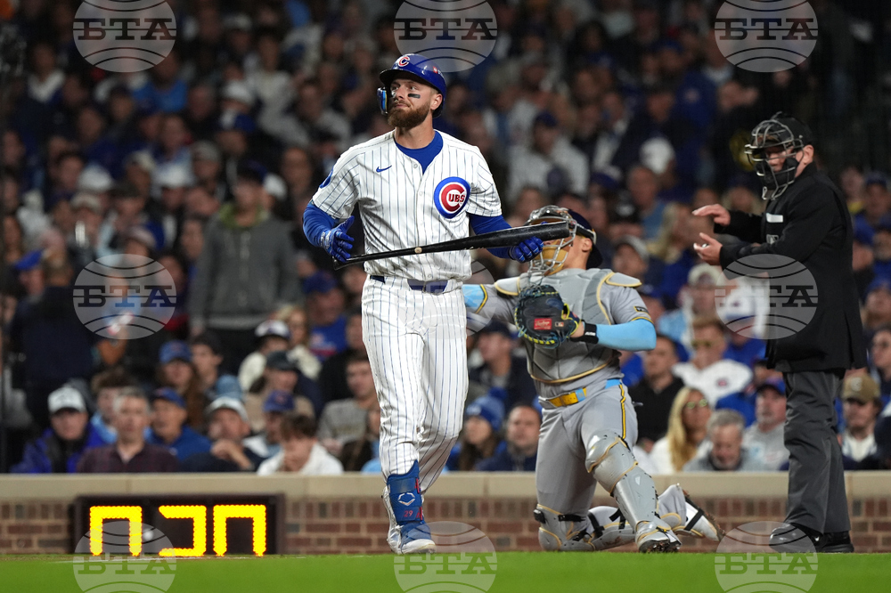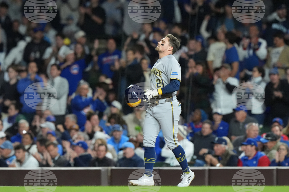 Milwaukee Brewers players finish batting practice before Game 4 of baseball's National League Division Series against the Chicago Cubs, Thursday, Oct. 9, 2025, in Chicago. (AP Photo/Nam Y. Huh)