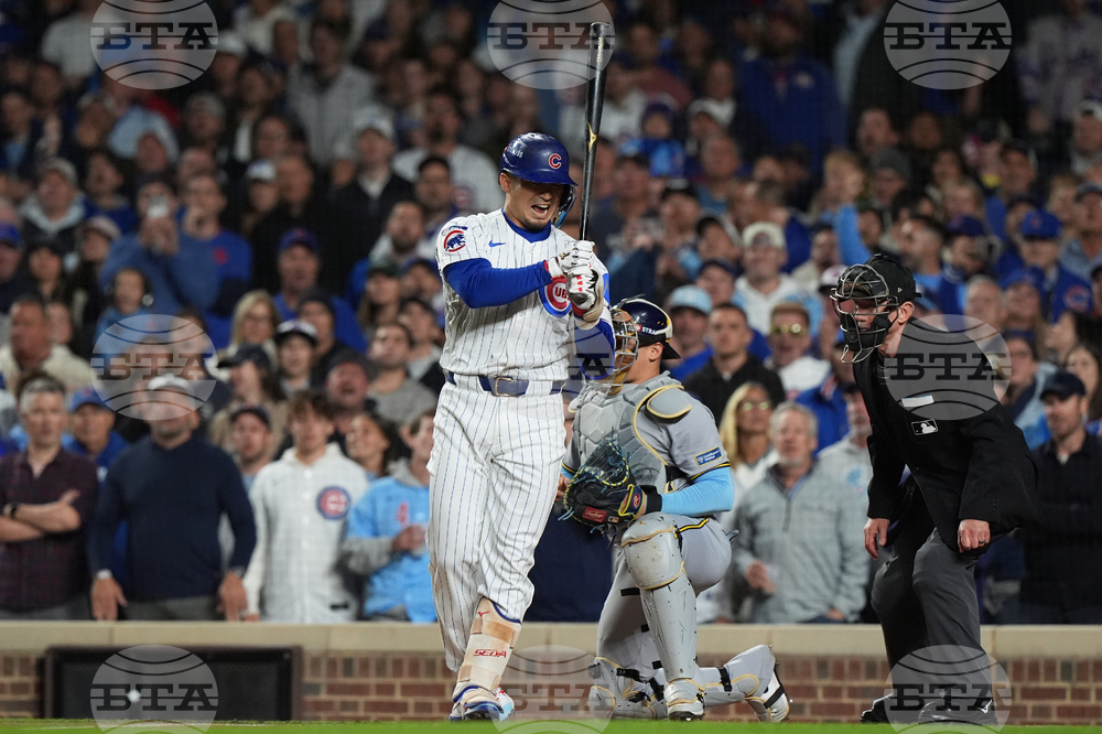 Chicago Cubs' Seiya Suzuki (27) reacts after striking out during the fifth inning of Game 4 of baseball's National League Division Series against the Milwaukee Brewers Thursday, Oct. 9, 2025, in Chicago. (AP Photo/Nam Y. Huh)