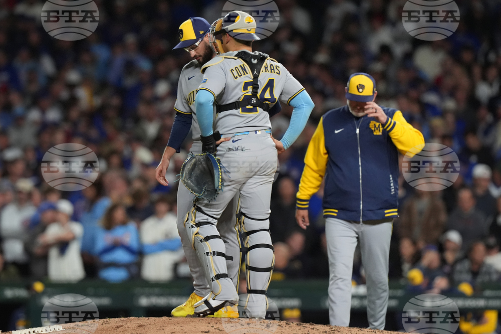 Milwaukee Brewers pitcher Aaron Ashby (26) and catcher William Contreras (24) talk as pitching coach Chris Hook comes to the mound during the sixth inning of Game 4 of baseball's National League Division Series against the Chicago Cubs Thursday, Oct. 9, 2025, in Chicago. (AP Photo/Nam Y. Huh)