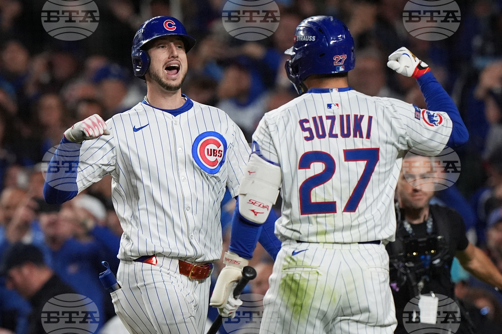 Chicago Cubs' Kyle Tucker (30) celebrates next to Seiya Suzuki (27) after hitting a solo home run during the seventh inning of Game 4 of baseball's National League Division Series against the Milwaukee Brewers Thursday, Oct. 9, 2025, in Chicago. (AP Photo/Erin Hooley)