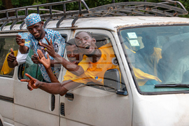 Supporters cheer from a car while taking part in a campaign for the National Salvation Front (FSNC) party in Maroua, Cameroon, Thursday, Oct. 9, 2025. (AP Photo/Welba Yamo Pascal)