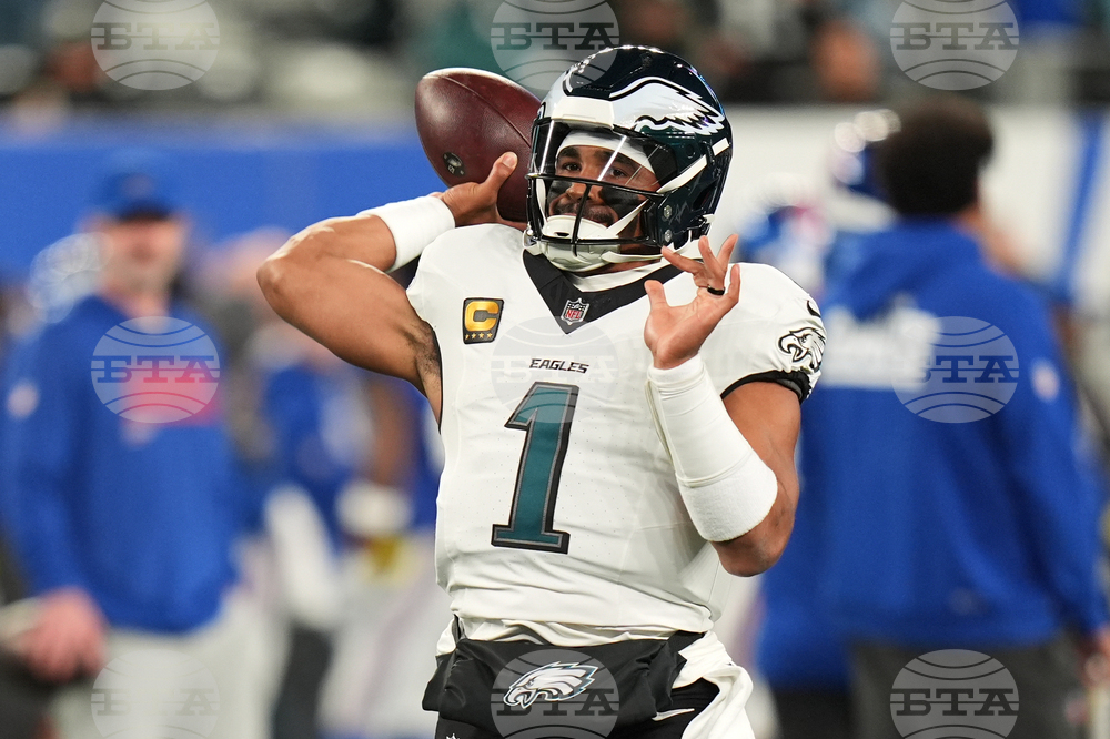 Philadelphia Eagles' Jalen Hurts warms up before an NFL football game against the New York Giants Thursday, Oct. 9, 2025, in East Rutherford, N.J. (AP Photo/Seth Wenig)