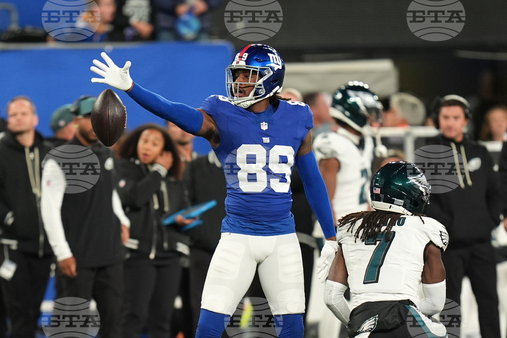 New York Giants' Theo Johnson, right, cannot hang onto a pass against Philadelphia Eagles' Adoree' Jackson during the second half of an NFL football game Thursday, Oct. 9, 2025, in East Rutherford, N.J. (AP Photo/Yuki Iwamura)