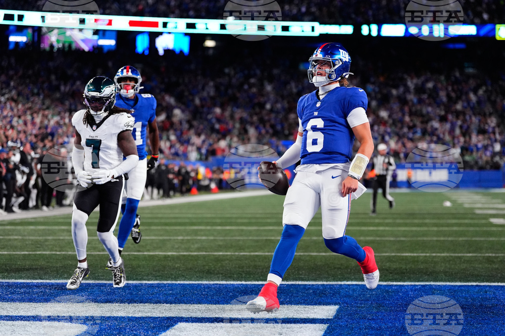 New York Giants' Jaxson Dart scores a touchdown during the first half of an NFL football game against the Philadelphia Eagles Thursday, Oct. 9, 2025, in East Rutherford, N.J. (AP Photo/Yuki Iwamura)