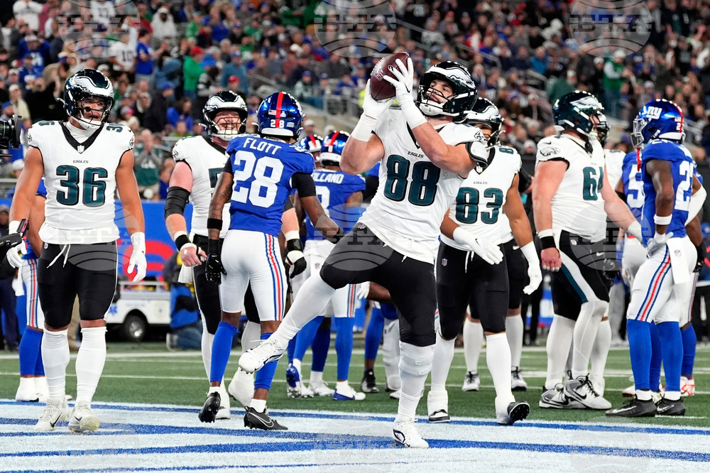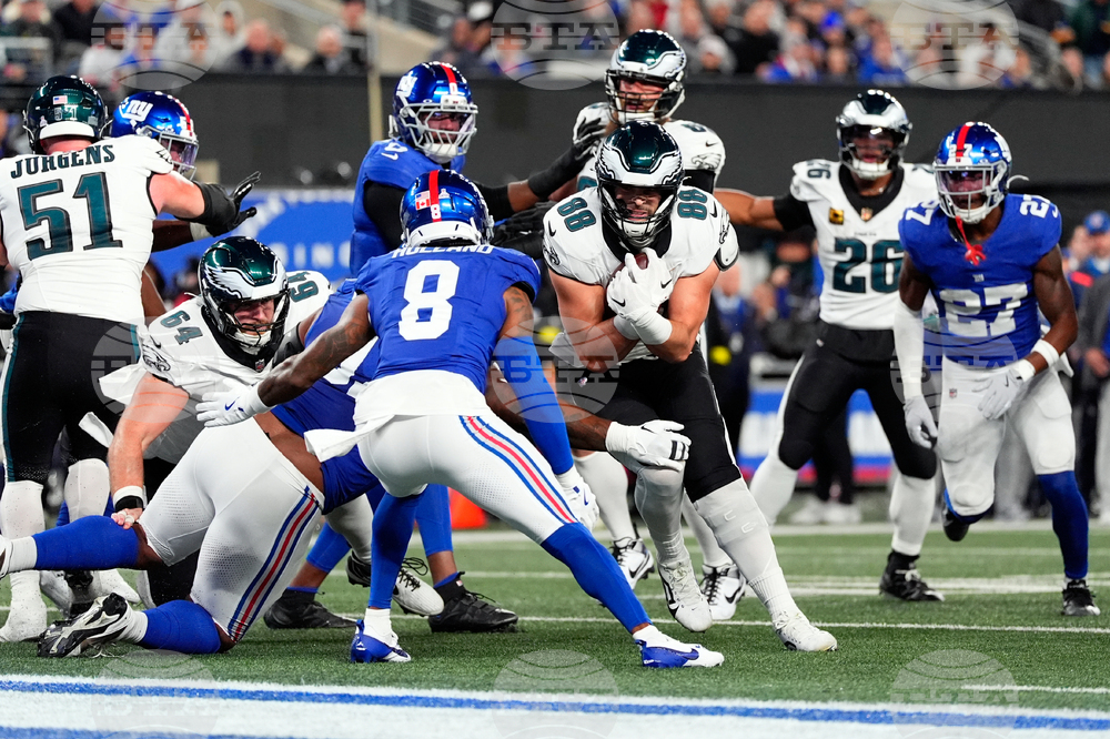 Philadelphia Eagles' Dallas Goedert (88) scores a touchdown against New York Giants' Jevon Holland (8) during the first half of an NFL football game Thursday, Oct. 9, 2025, in East Rutherford, N.J. (AP Photo/Yuki Iwamura)
