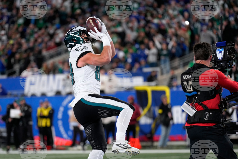 Philadelphia Eagles' Dallas Goedert celebrates after scoring a touchdown during the first half of an NFL football game against the New York Giants Thursday, Oct. 9, 2025, in East Rutherford, N.J. (AP Photo/Yuki Iwamura)