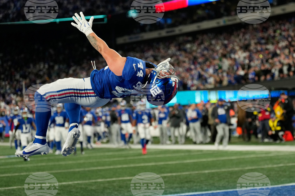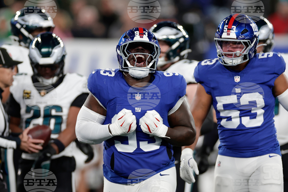 New York Giants' Brian Burns reacts after sacking Philadelphia Eagles' Jalen Hurts during the first half of an NFL football game Thursday, Oct. 9, 2025, in East Rutherford, N.J. (AP Photo/Seth Wenig)