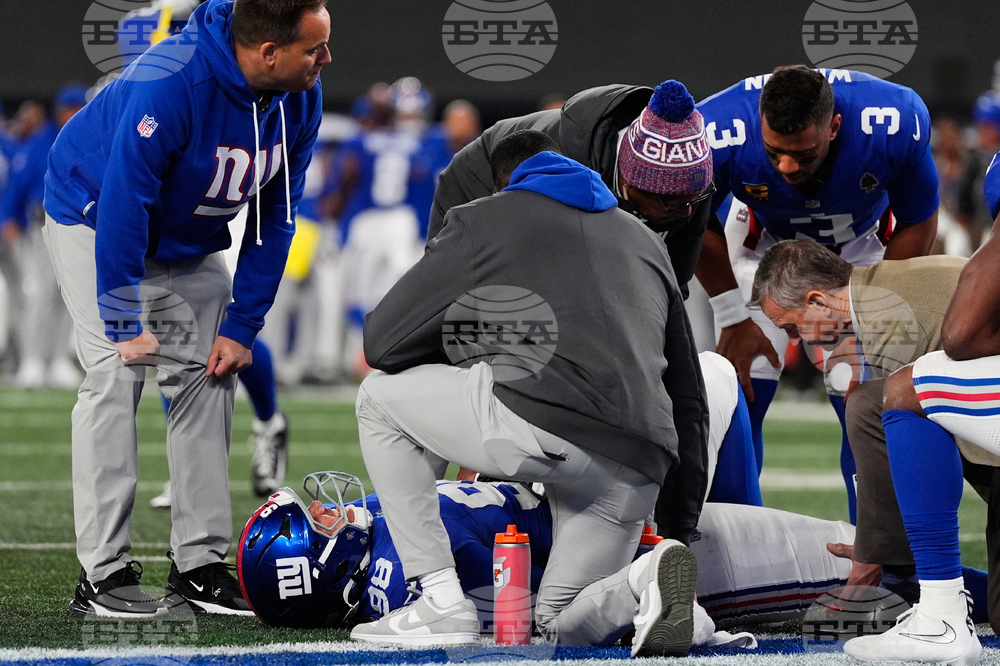 New York Giants' DJ Davidson lies on the field after an injury during the first half of an NFL football game against the Philadelphia Eagles Thursday, Oct. 9, 2025, in East Rutherford, N.J. (AP Photo/Yuki Iwamura)