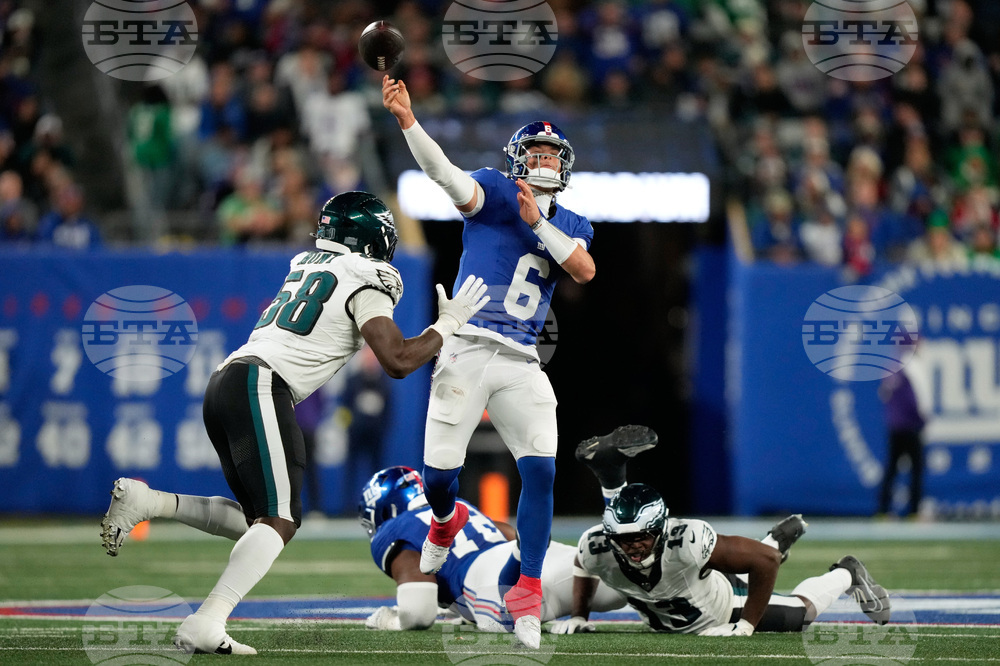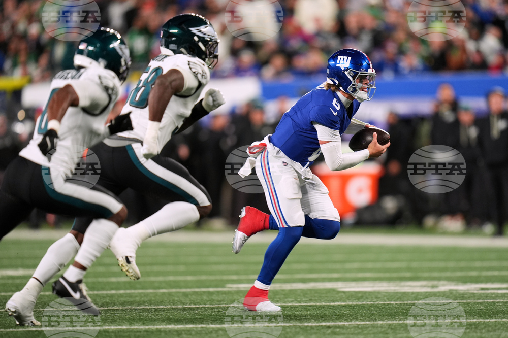 New York Giants' Jaxson Dart plays during the first half of an NFL football game against the Philadelphia Eagles Thursday, Oct. 9, 2025, in East Rutherford, N.J. (AP Photo/Yuki Iwamura)