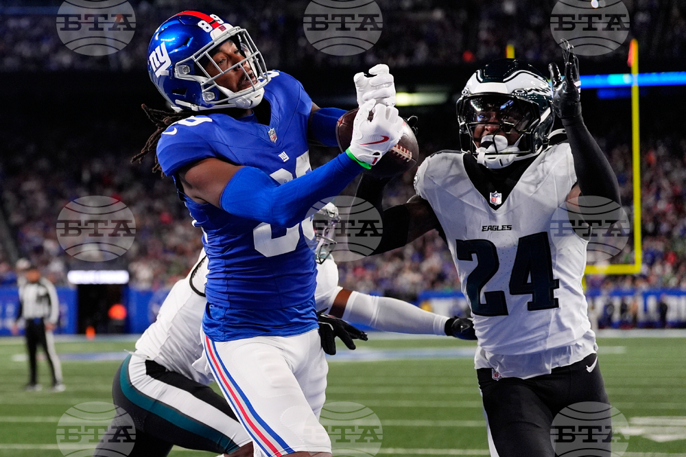 New York Giants' Lil'Jordan Humphrey, left, cannot hang onto a pass in the endzone against Philadelphia Eagles' Andrew Mukuba during the first half of an NFL football game Thursday, Oct. 9, 2025, in East Rutherford, N.J. (AP Photo/Yuki Iwamura)