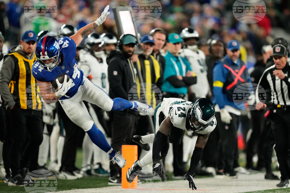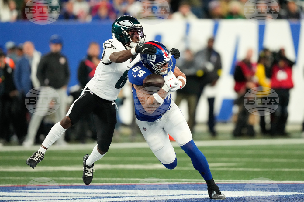 Philadelphia Eagles' Dallas Goedert, right, tries to get past New York Giants' Tyler Nubin during the second half of an NFL football game Thursday, Oct. 9, 2025, in East Rutherford, N.J. (AP Photo/Yuki Iwamura)