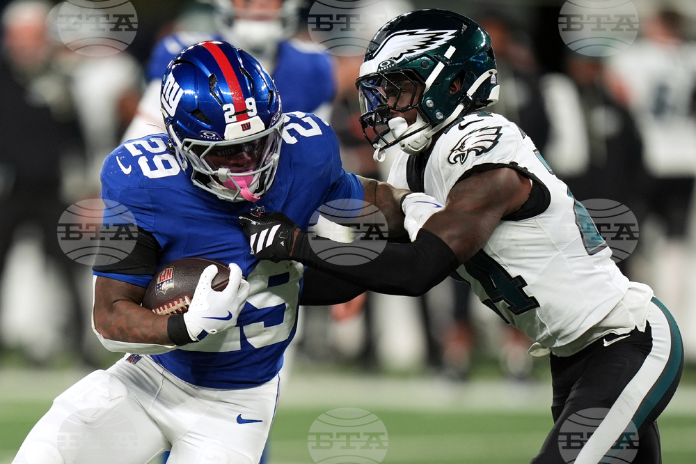 Philadelphia Eagles' Jalen Hurts, left, tries to get [past New York Giants' Darius Muasau during the first half of an NFL football game Thursday, Oct. 9, 2025, in East Rutherford, N.J. (AP Photo/Yuki Iwamura)