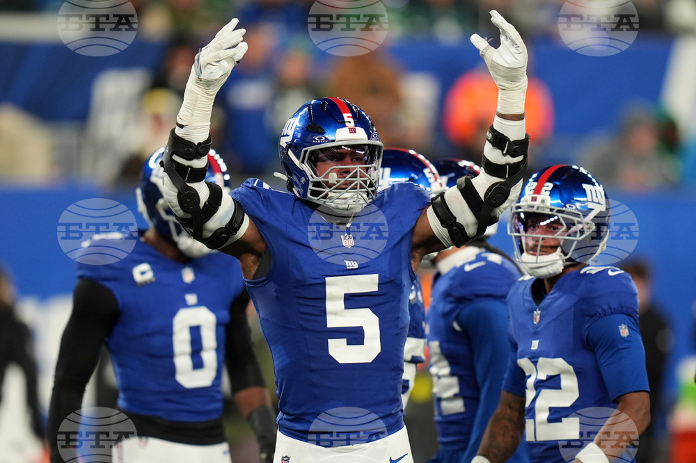 New York Giants' Rakeem Nunez-Roches reacts after a tackle during the first half of an NFL football game against the Philadelphia Eagles Thursday, Oct. 9, 2025, in East Rutherford, N.J. (AP Photo/Adam Hunger)